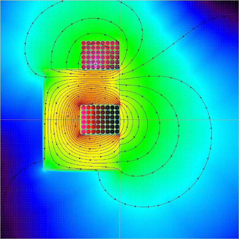 Die Auslegung von Drosseln und Übertragern für getaktete Anwendungen gehört ebenso zu unserem Spezialgebiet wie die Berechnung von Spulen für spezielle Einsatzfälle. Dabei können neben den Verlusten in den Wicklungen und Kernen auch das Magnetfeld selbst berechnet und visualisiert werden. Die Kontrolle der berechneten Werte kann auch durch Messungen mit einer Magnetfeldsonde erfolgen.