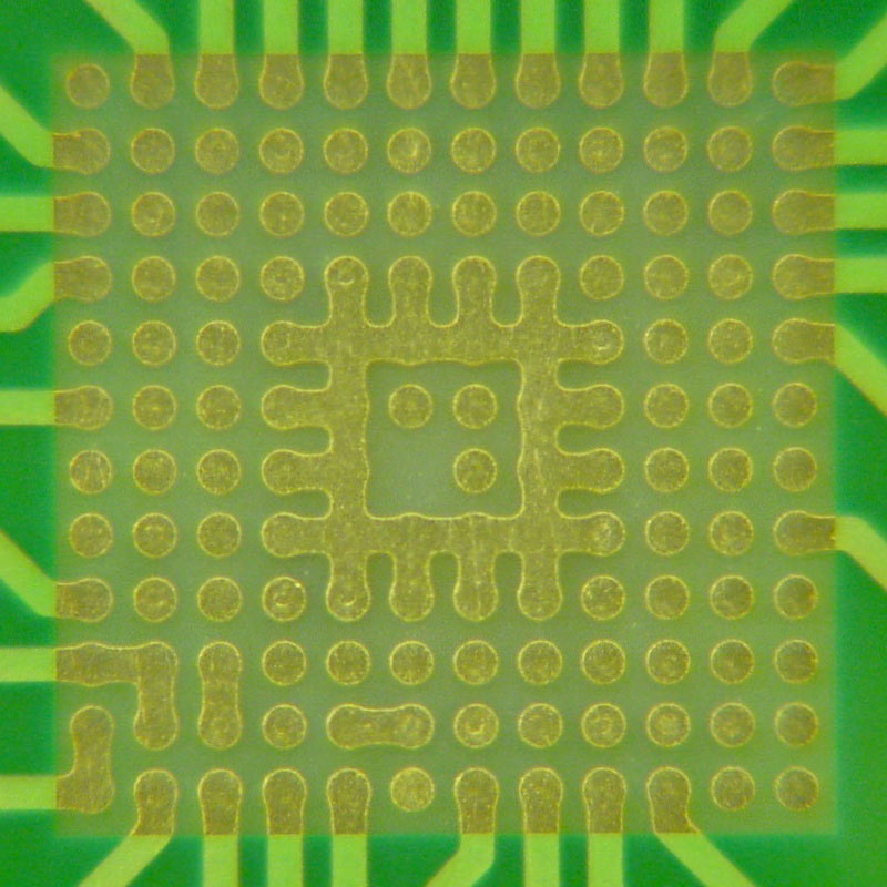 Platinen für BGA-Bausteine benötigen bei immer kleiner werdenden Pad-Abständen sogenannte „plugged vias“ (plan gefüllte Bohrungen innerhalb der Landefläche der Pads). Wir können diese Technologie in bester Qualität anbieten.